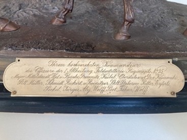 Die Skulptur aus unseren Beständen wurde zu Beginn des 20. Jahrhunderts dem scheidenden Kommandeur des 1. Westpreußischen Feldartillerie-Regiments Nr. 35 als Abschiedsgeschenk von seinen ihm untergebenen Offizieren überreicht. Das Regiment mit Sitz in Deutsch Eylau war 1890 gegründet worden und bis 1912 Teil des XVII. Armeekorps Danzig, später des XX. Armeekorps Allenstein.